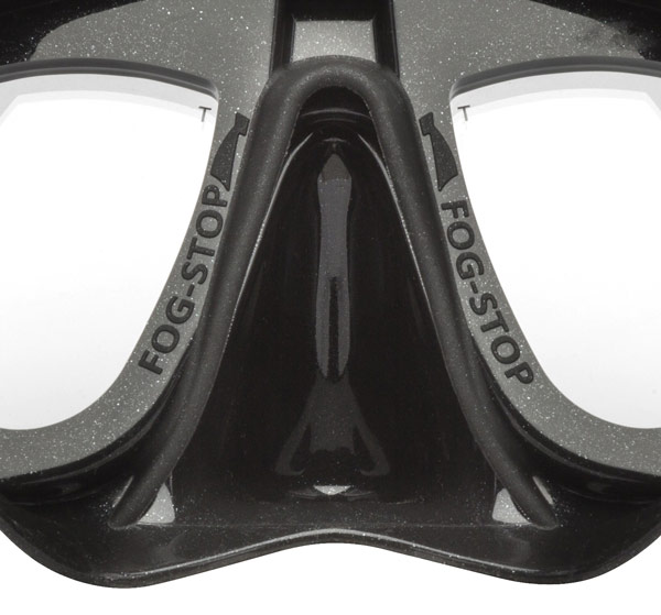 Cressi Fog Stop System. A patented membrane surrounding the inner nose pocket which acts as a barrier and traps any moisture escaping from the diver’s nose involuntarily when breathing through the mouth.