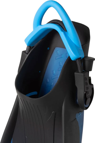 The heel piece is in soft, anatomical rubber. The grab handle for fitting the fin wraps around the ankle so as to reduce protrusion and avoid chafing while swimming