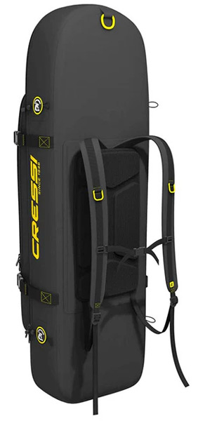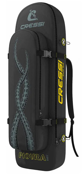 The Cressi Piovra Fins Backpack is designed for transporting spearfishing and freediving gear. It features a main compartment big enough for storing a pair of long fins up to 100 cm (39 inch) — equipped with a netting for ventilation. It is possible to store a wetsuit, mask, snorkels, belt and various spearfishing gear.