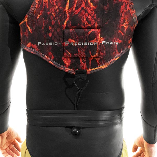 Most good weight vests attach to your weight belt in one form or another making it hard to quickly separate the belt from the vest in an emergency. The Camo weight vest uses a simple plastic ball that tucks under the belt and locates the vest snug on your back to avoid it riding up your shoulders when duck diving.