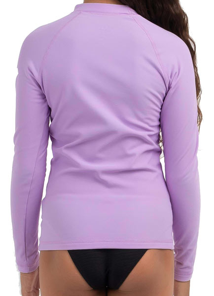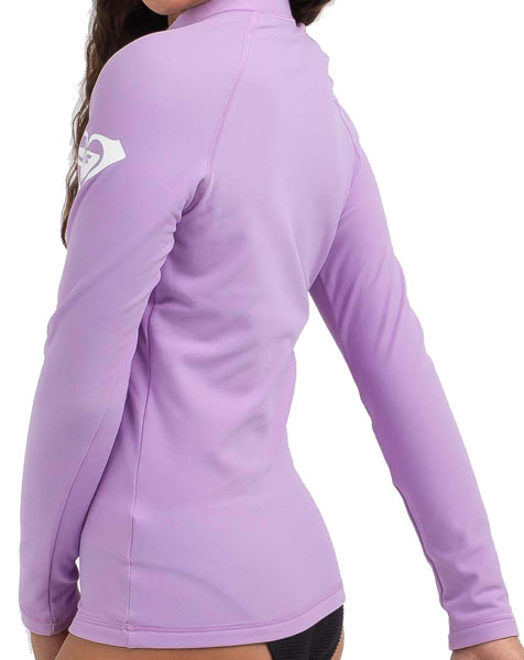 The Roxy Girls' Heater Long Sleeve Lycra Rash Vest in Crocus Petal offers sun protection in a stylish purple hue. Ideal for active days at the beach, even in the colder months due to it's thermal layer.